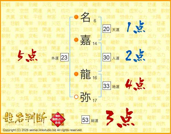 名(6画)嘉(14画) 龍(16画)弥(17画)