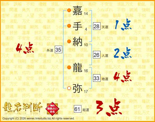 嘉(14画)手(4画)納(10画) 龍(16画)弥(17画)