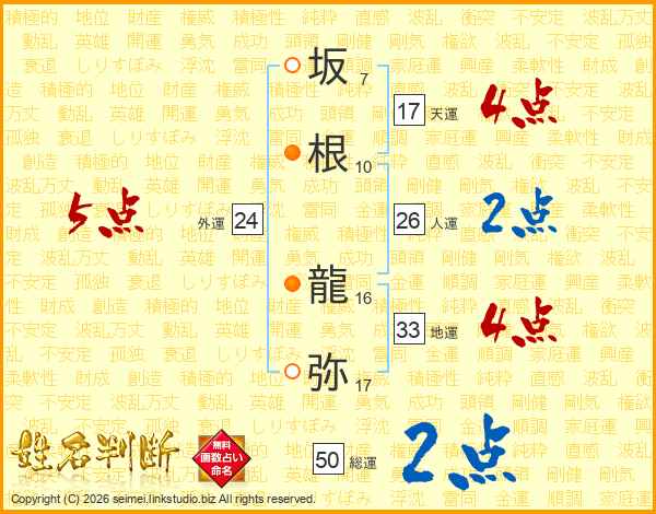 坂(7画)根(10画) 龍(16画)弥(17画)