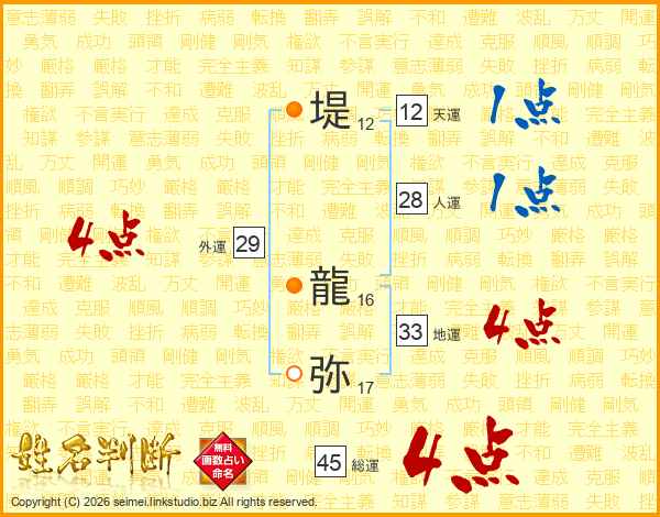 堤龍弥さんの総運は45画の4点!