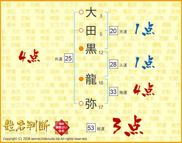 大(3画)田(5画)黒(12画) 龍(16画)弥(17画)