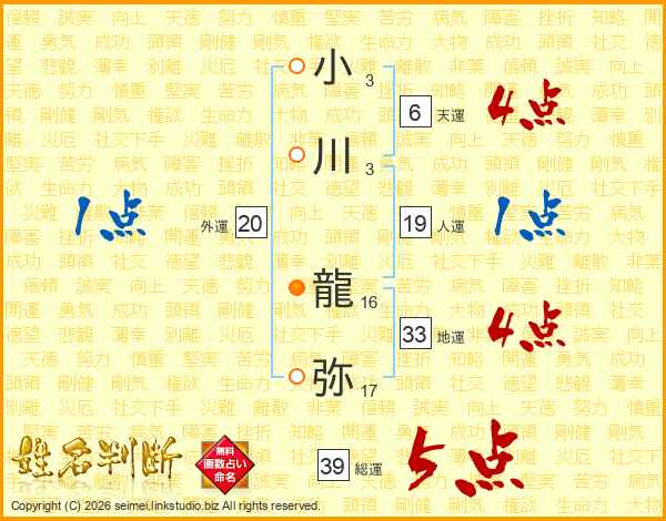 生活面を象徴する運勢です。外部から受ける影響力を表し、結婚運、家庭運や職場、環境への順応性を表します。総運から人運を引いた画数。姓や名が1文字の場合を除く。