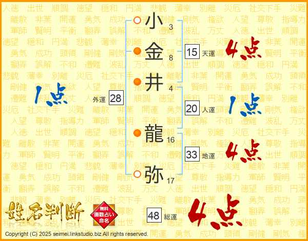 小(3画)金(8画)井(4画) 龍(16画)弥(17画)