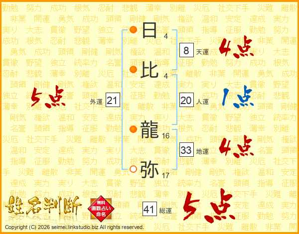 画数の奇数(○陽)と偶数(●陰)の配列で吉凶を占います。どちらかにかたよる名前は大凶名で避ける必要があります。画数の奇数偶数。