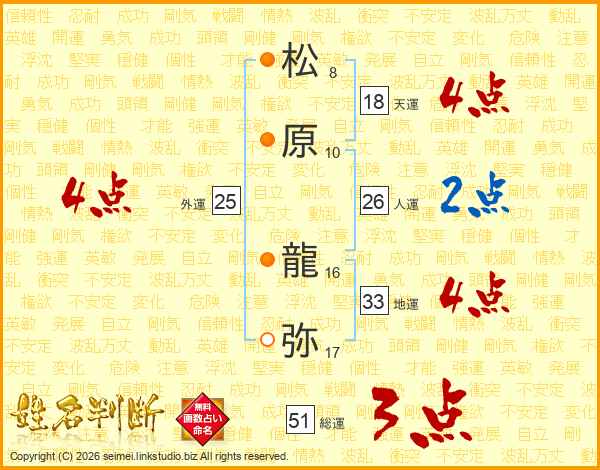 あなたの人生を表す1番重要な運勢です。生涯を通じて影響する総合運となり、主に50歳以降の晩年期に影響を及ぼします。苗字と名前の合計画数。