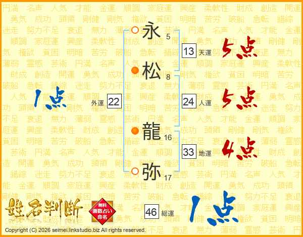 生活面を象徴する運勢です。外部から受ける影響力を表し、結婚運、家庭運や職場、環境への順応性を表します。総運から人運を引いた画数。姓や名が1文字の場合を除く。