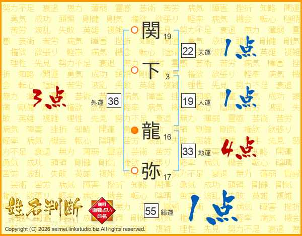 生活面を象徴する運勢です。外部から受ける影響力を表し、結婚運、家庭運や職場、環境への順応性を表します。総運から人運を引いた画数。姓や名が1文字の場合を除く。