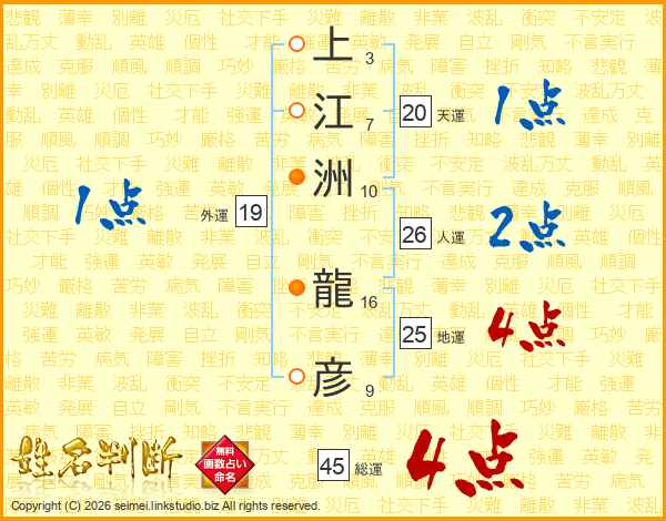 上(3画)江(7画)洲(10画) 龍(16画)彦(9画)