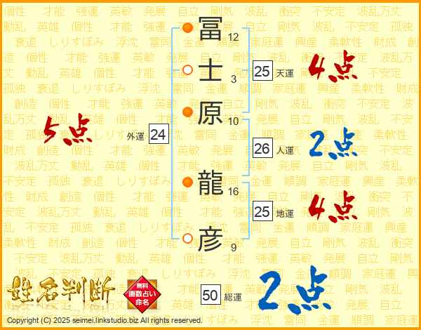 冨(12画)士(3画)原(10画) 龍(16画)彦(9画)