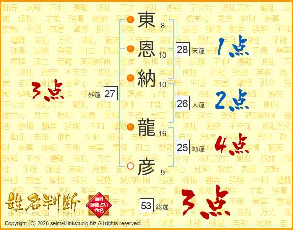 東(8画)恩(10画)納(10画) 龍(16画)彦(9画)