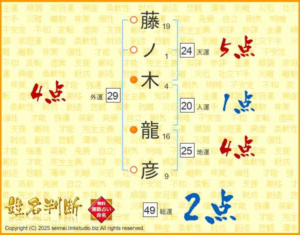 藤(19画)ノ(1画)木(4画) 龍(16画)彦(9画)