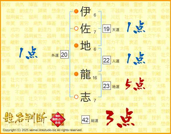 伊(6画)佐(7画)地(6画) 龍(16画)志(7画)