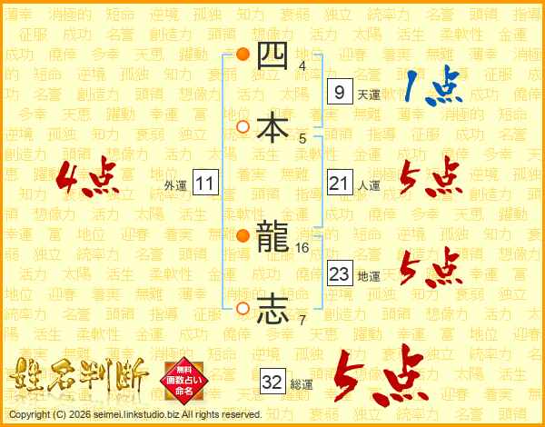 あなたの人生を表す1番重要な運勢です。生涯を通じて影響する総合運となり、主に50歳以降の晩年期に影響を及ぼします。苗字と名前の合計画数。