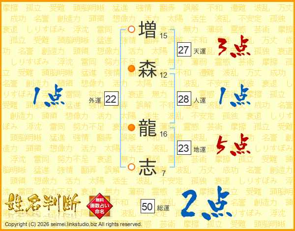 生活面を象徴する運勢です。外部から受ける影響力を表し、結婚運、家庭運や職場、環境への順応性を表します。総運から人運を引いた画数。姓や名が1文字の場合を除く。