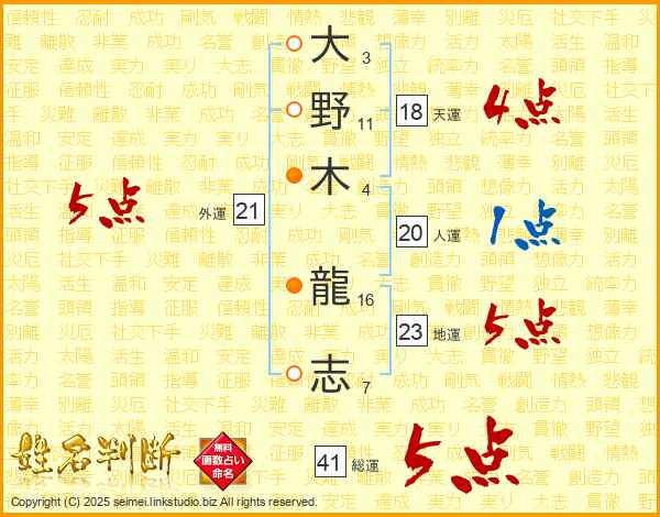 大(3画)野(11画)木(4画) 龍(16画)志(7画)