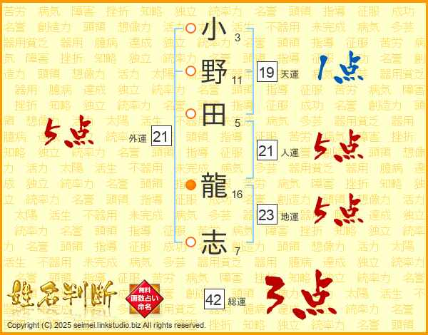 小(3画)野(11画)田(5画) 龍(16画)志(7画)