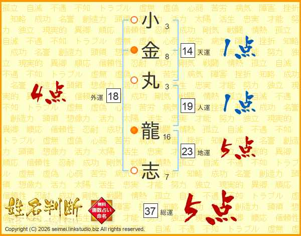 小(3画)金(8画)丸(3画) 龍(16画)志(7画)