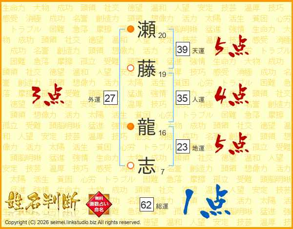 瀬(20画)藤(19画) 龍(16画)志(7画)