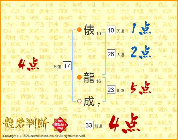 俵龍成さんの総運は33画の4点!