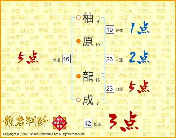 家系が持つ宿命的な運勢を表します。祖先から受け継いだ苗字ですので自分の力が及びません。家柄を象徴します。苗字の合計画数。
