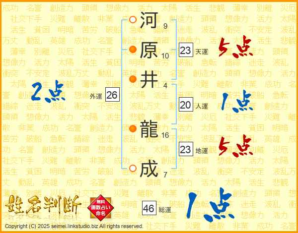 生活面を象徴する運勢です。外部から受ける影響力を表し、結婚運、家庭運や職場、環境への順応性を表します。総運から人運を引いた画数。姓や名が1文字の場合を除く。