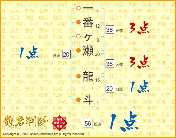 一番ヶ瀬龍斗さんの総運は56画の1点!