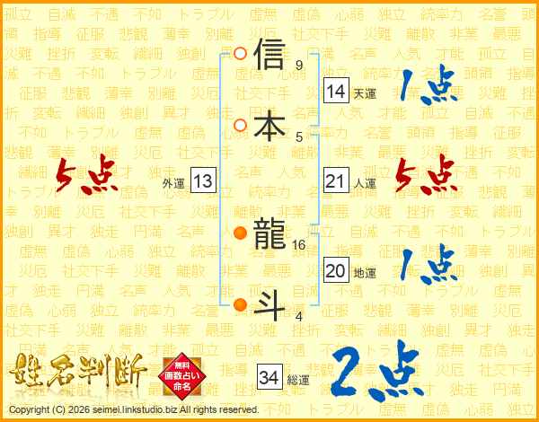 信本龍斗さんの総運は34画の2点!