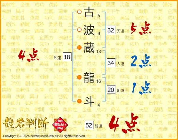 古(5画)波(9画)蔵(18画) 龍(16画)斗(4画)