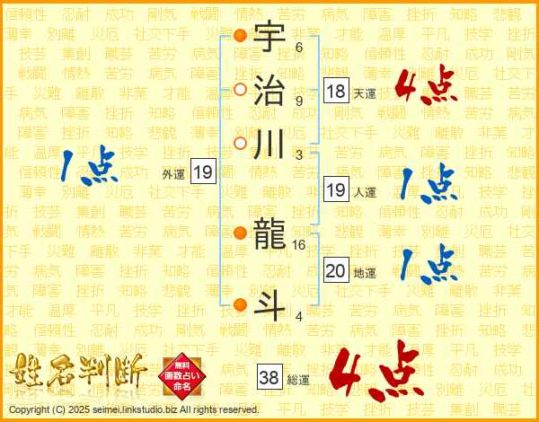 宇(6画)治(9画)川(3画) 龍(16画)斗(4画)