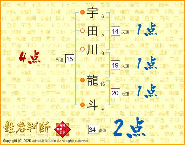 宇(6画)田(5画)川(3画) 龍(16画)斗(4画)