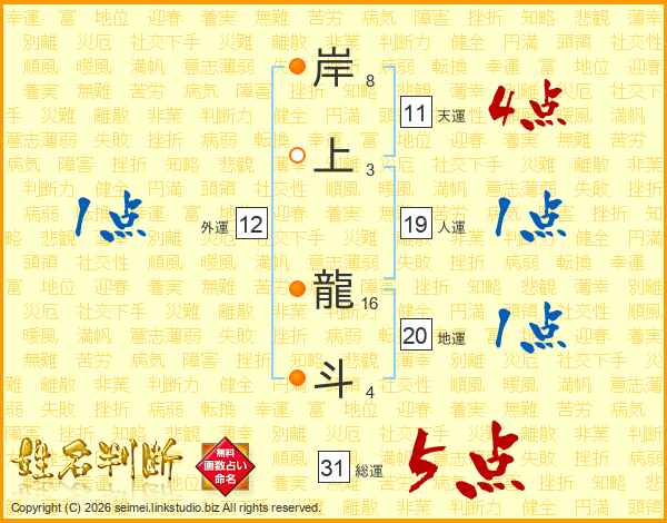 岸(8画)上(3画) 龍(16画)斗(4画)