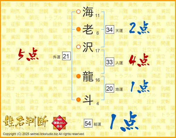 海(11画)老(6画)沢(17画) 龍(16画)斗(4画)