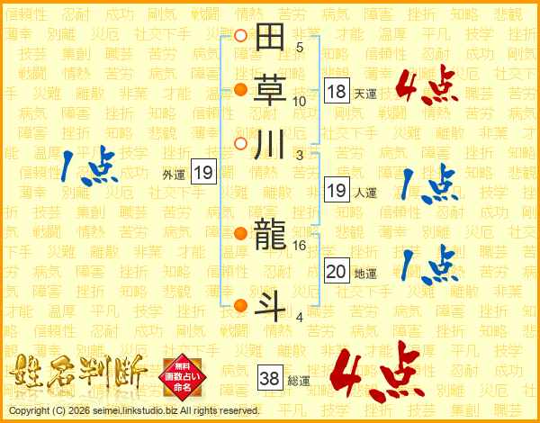 田草川龍斗さんの総運は38画の4点!