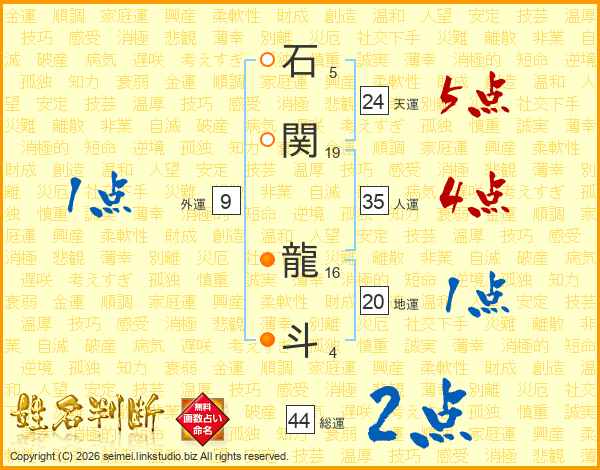 家系が持つ宿命的な運勢を表します。祖先から受け継いだ苗字ですので自分の力が及びません。家柄を象徴します。苗字の合計画数。