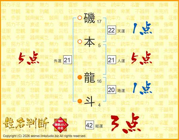 磯(17画)本(5画) 龍(16画)斗(4画)