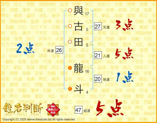 與(17画)古(5画)田(5画) 龍(16画)斗(4画)