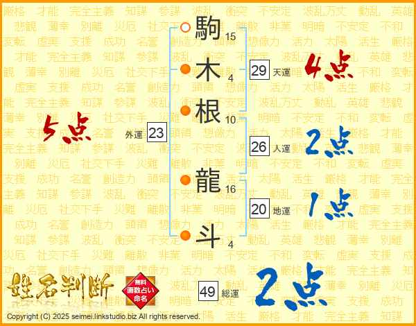 駒(15画)木(4画)根(10画) 龍(16画)斗(4画)