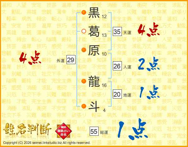黒(12画)葛(13画)原(10画) 龍(16画)斗(4画)