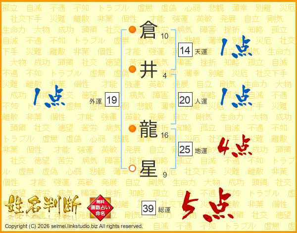 生活面を象徴する運勢です。外部から受ける影響力を表し、結婚運、家庭運や職場、環境への順応性を表します。総運から人運を引いた画数。姓や名が1文字の場合を除く。