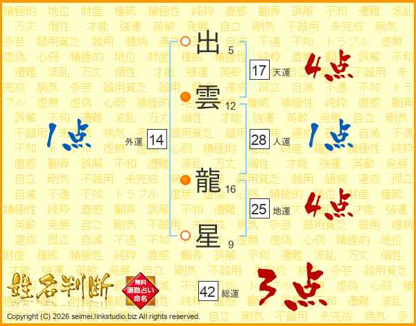 生活面を象徴する運勢です。外部から受ける影響力を表し、結婚運、家庭運や職場、環境への順応性を表します。総運から人運を引いた画数。姓や名が1文字の場合を除く。