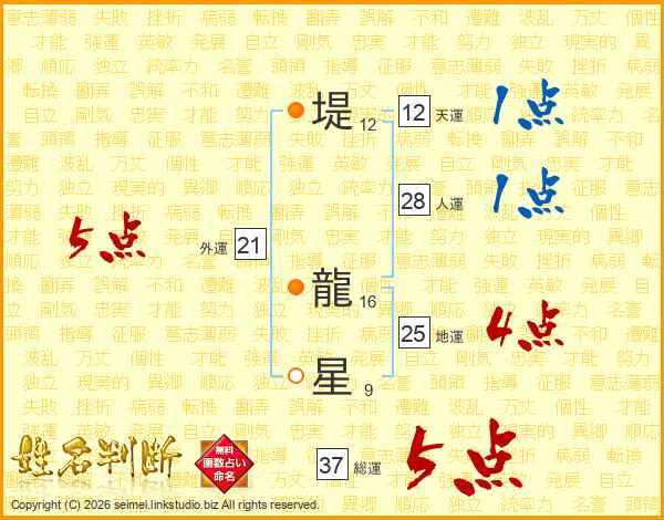堤(12画) 龍(16画)星(9画)