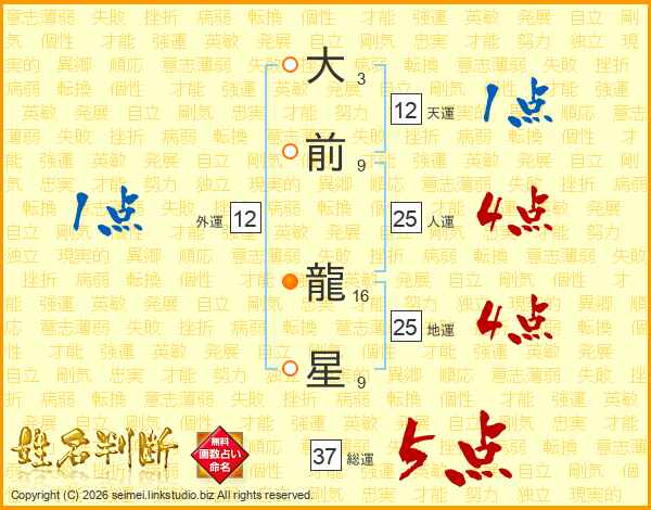 大前龍星さんの総運は37画の5点!