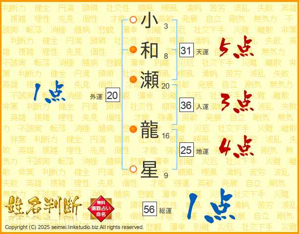 小(3画)和(8画)瀬(20画) 龍(16画)星(9画)