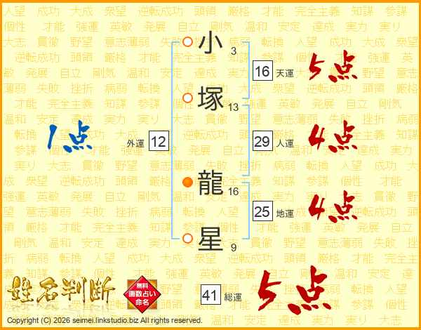 あなたの人生を表す1番重要な運勢です。生涯を通じて影響する総合運となり、主に50歳以降の晩年期に影響を及ぼします。苗字と名前の合計画数。
