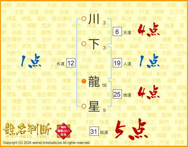 生活面を象徴する運勢です。外部から受ける影響力を表し、結婚運、家庭運や職場、環境への順応性を表します。総運から人運を引いた画数。姓や名が1文字の場合を除く。