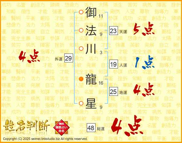 御(11画)法(9画)川(3画) 龍(16画)星(9画)