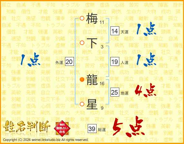 梅下龍星さんの総運は39画の5点!