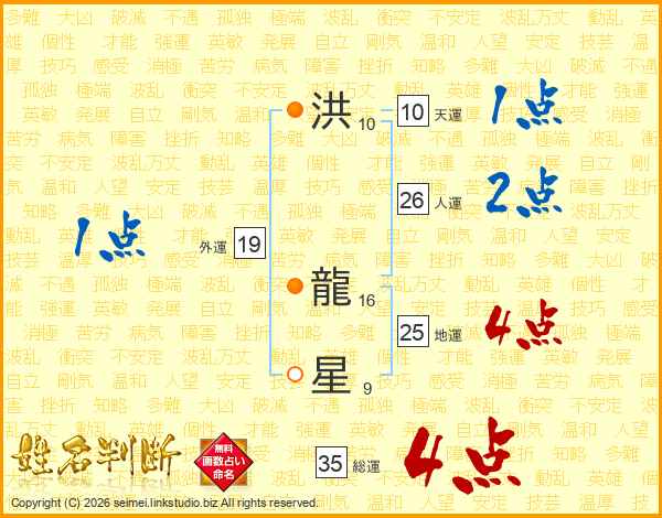 洪(10画) 龍(16画)星(9画)