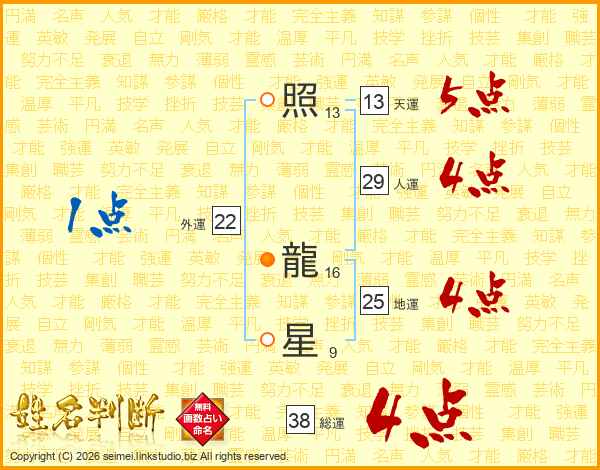 生活面を象徴する運勢です。外部から受ける影響力を表し、結婚運、家庭運や職場、環境への順応性を表します。総運から人運を引いた画数。姓や名が1文字の場合を除く。