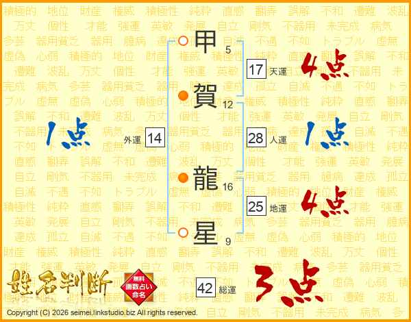 甲(5画)賀(12画) 龍(16画)星(9画)